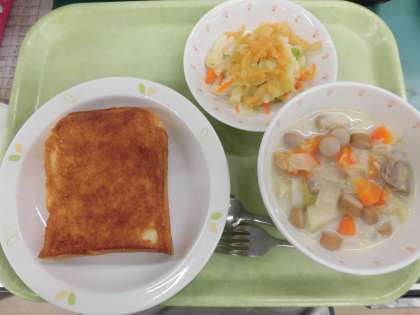 「シナモントースト、ミルクポトフ、パリパリサラダ、牛乳」です。