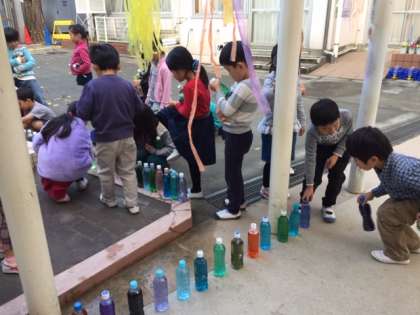 きれいな色の水が入ったペットボトルを1年生が正門近くに並べています。これも作品です。
