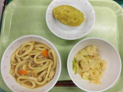 「カレーうどん、キャベツのちゅうかかけ、スイートポテト、牛乳」です。