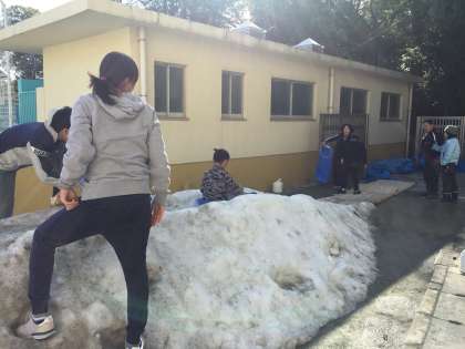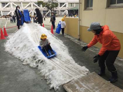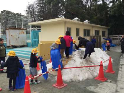 昨日から南門近くに子どもたちが楽しみにしていた雪のすべり台が出現しました。13日の日曜日、世田小地域ネットいぶきのみなさんが作り上げてくださいました。教職員も手伝いました。区役所前広場から届いたダンプカー2台分の雪をみなで力を合わせてすべり台にしました。児童数が増えた関係で今年は1・2年生と仲よしの子どもたち限定ですが、みな楽しんでいます。