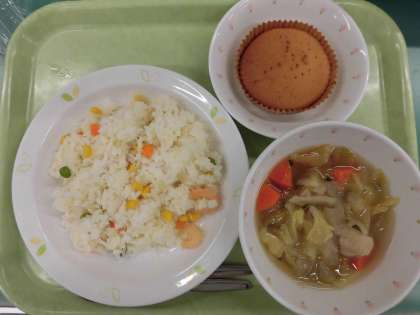 「さんしょくピラフ、ポトフ、ココアケーキ、牛乳」です。