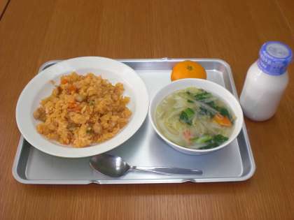 今日の給食は、チキンライス・牛乳・ベーコンと白菜のスープ・みかんです。