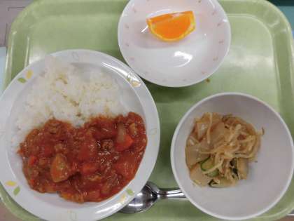 「ハッシュドポークライス、こんにゃくサラダ、くだもの、牛乳」です。
