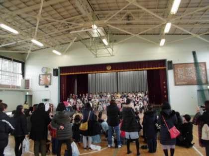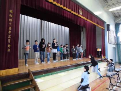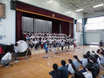 今日は音楽朝会があり、1年生と仲よし学級が発表しました。音楽の時間に一生懸命に練習した成果を発表しました。たくさんのお父さん、お母さんが来てくれてよかったですね。