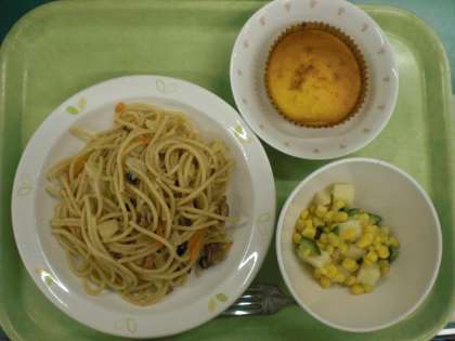 今日は2月のバースデー給食の日です。28名のみなさんがお誕生日を迎えました。献立は、和風スパゲッティ、マセドアンサラダ、キャロットケーキです。キャロットケーキには、すりおろしたにんじんとオレンジジュースが入っています。にんじんが苦手でもこのケーキなら食べられるという子が多いです。