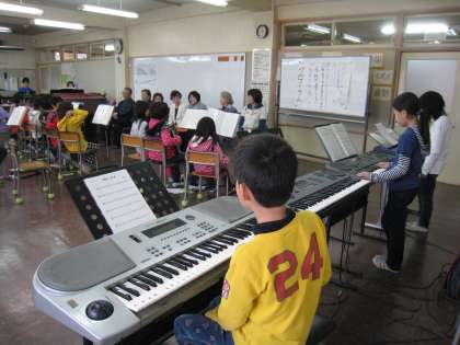 プログラムの最後は、卒業式に向けて今音楽で練習中の「威風堂々」の演奏です。子どもたちは、難しい曲目を選びましたが、無事演奏を終えにっこりとしていました。