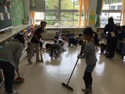 黙々と階段で雑巾がけをする児童、ほうきを上手に使ってごみを掃き集める児童、みな一生懸命です。1年生の教室では6年生のお兄さんお姉さんが掃除の仕方を教えています。素晴らしいと思います。