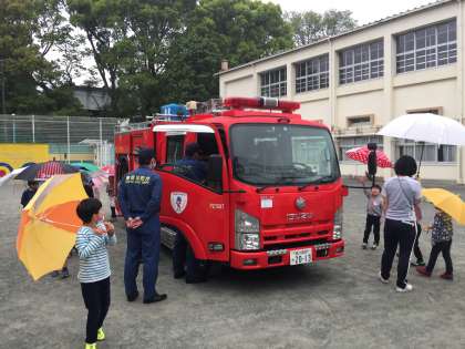 校庭で消防自動車を見ながら描くはずでしたが、残念ながら雨です。
