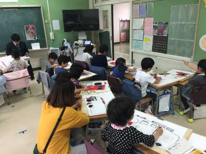 来てくださった消防士さんと消防自動車を傘を差しながらしっかり見て、教室に戻って記憶と写真等を参考に描きました。みなすごい集中力です。