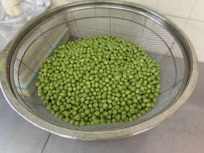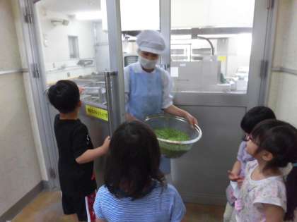 今日の給食のグリンピースごはんは、1年生がグリンピースのさやむきを手伝ってくれました。とても上手にむいてくれました。むいた後は、給食室にグリンピースを届けてくれました。