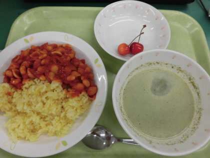 今月のオリパラ給食はエジプト料理のコシャリとモロヘイヤのポタージュです。コシャリはエジプトでよく食べられているといわれている料理です。モロヘイヤはエジプト発症の野菜として知られています。