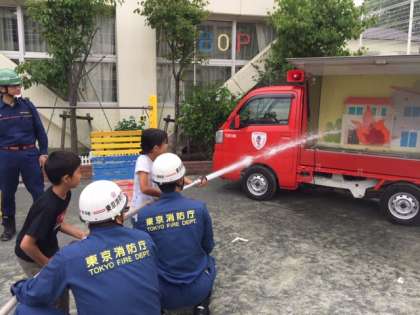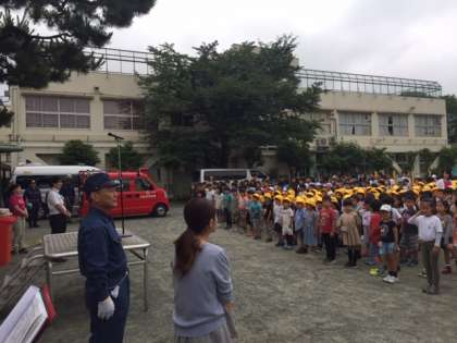 今日は合同防災訓練です。町会、消防署、消防団、経堂まちづくりセンターの皆さんが来てくださっています。子どもたちは起震車に乗ったり、煙体験をしたり、消火訓練をしたりします。とても貴重な体験になります。災害があった場合には共に助け合うことが重要になります。地域の皆さんが力を合わせて防災にあたることを体験を通して実感できます。保護者、地域の皆様もたくさん参加してくださっています。ありがとうこざいます。