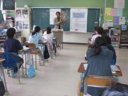 続いて、5年生の教室ではインドネシアの学生と勉強です。影絵のようなペープサートやジャワ更紗の地図などを見せてくれて、国の紹介をしてくれました。