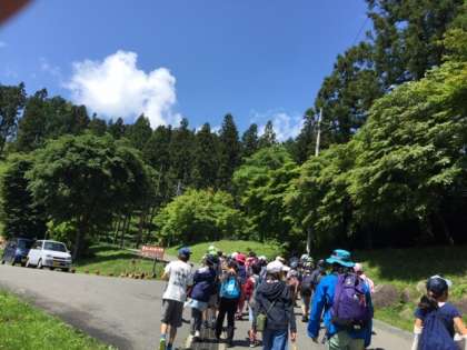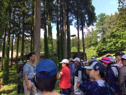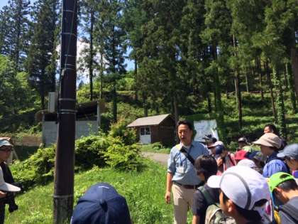 里山入門です。宿舎の周りの里山でガイドさんの話を聞きます。つる性植物の役割、日本の造林技術、珍しい昆虫、キバネツノトンボなどなど、話は多岐に渡ります。みんな興味津々。
