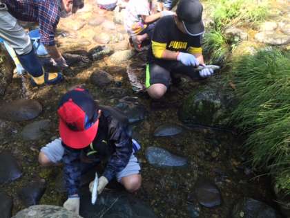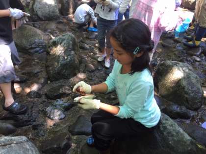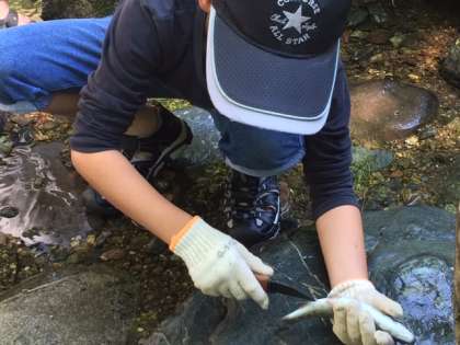 魚のさばき体験をします。希望者のみですが、命をいただく体験は貴重です。みんなの真剣な表情からもわかります。