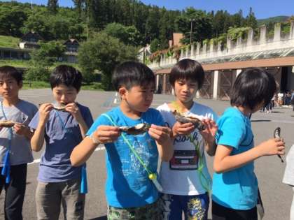 ニジマスが焼けました。みんなで外で食べます。「めっちゃおいしい!」