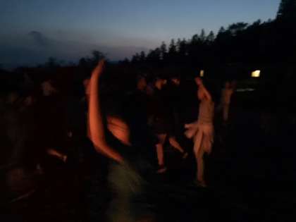 火を囲んでの御神楽です。かっこいいです。かけ声が響きます。