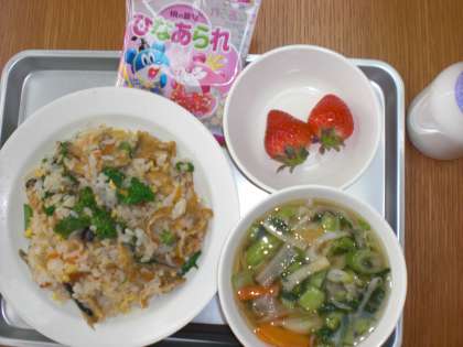 今日の給食は、菜の花ずし・沢煮椀・ひなあられ・牛乳・いちごです。