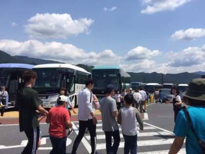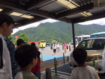 談合坂サービスエリアです。トイレ休憩です。ツバメの雛がいます。みんなで巣を見あげました。良い天気です。
