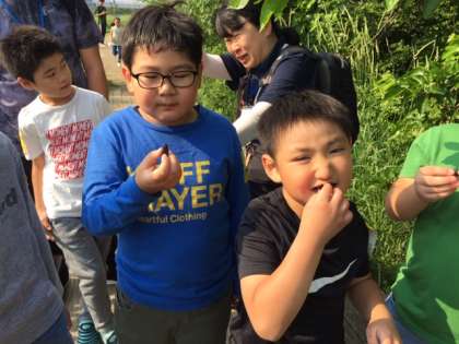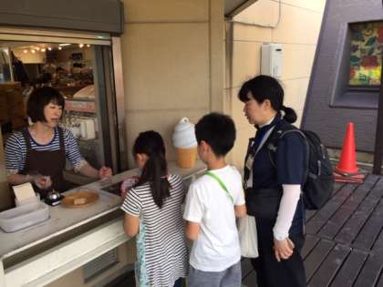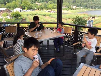 お風呂あがりに、ソフトクリームを食べに行きました。みんな大満足です。途中桑の実をつまんでいきました。