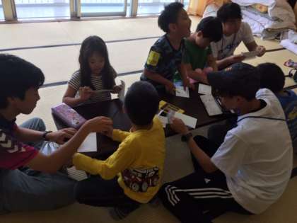 葉書を書いています。書き終えたらポストに投函します。お家に着いたら、この葉書を読みながらたくさんお話をしてください。