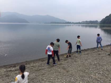 最終日の朝のお散歩です。残念ながら曇です。富士山は見えません。湖畔で石投げして楽しそうです。