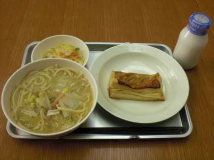 今日の給食は、サッポロラーメン・ラーパーツァイ・牛乳・アップルパイです。