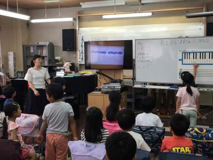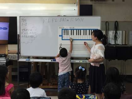 「ドレドレ・マスターになろう!」です。鍵盤上のドの位置をみんなで探し、レの位置も確かめて、演奏です。ドとレだけでも音楽になるのです。みんな楽しそう!