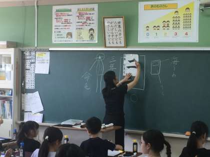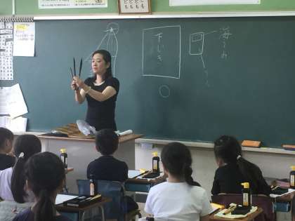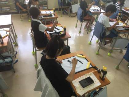 ゲストティーチャーをお招きして、毛筆の学習をしました。準備の仕方、筆の使い方等、基本をしっかり教えていただき、漢数字の「二」を書きましら。元気で大きな「二」をみんな書いていました。