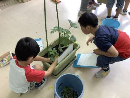 仲よし学級では5月からオクラ,キュウリ,ピーマン,ミニトマトをプランターで育てています。今日はどのくらい成長したか,野菜の観察をしました。子どもたちは,実際に葉っぱを手で触ったり,葉っぱでにおいをかいだりして,「ざらざらする」「トマトのにおいがする」と興味津々で観察しました。草取りをしたり水やりをしたりして,大事に手入れをしました。あとはたくさん収穫できるかどうか楽しみですね。
