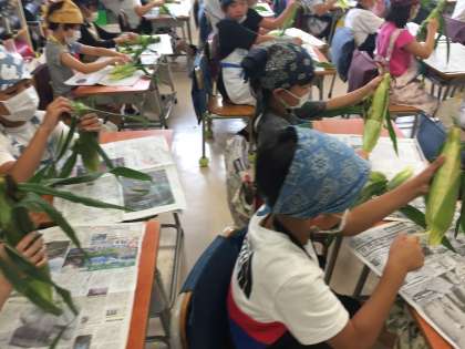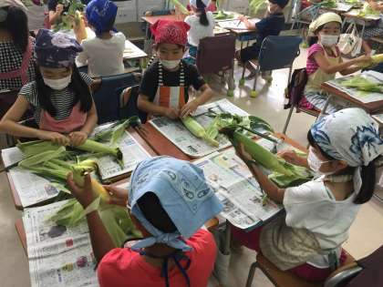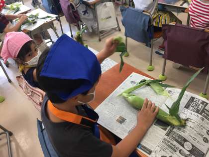 今日の給食で食べるトウモロコシの皮をむきました。トウモロコシがどのようになるのかについても、栄養士の先生が実物を持ち込んで説明していました。手触りを楽しんだりして、みな一生懸命やっていました。