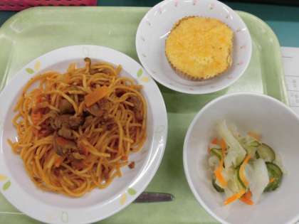 今日はバースデー給食の日です。メニューはスパゲッティナポリタン、野菜のレモン風サラダ、オレンジケーキです。オレンジケーキはマーマレードジャムをたっぷり使ったケーキです。6月のお誕生日をむかえたみなさんおめでとうございます。