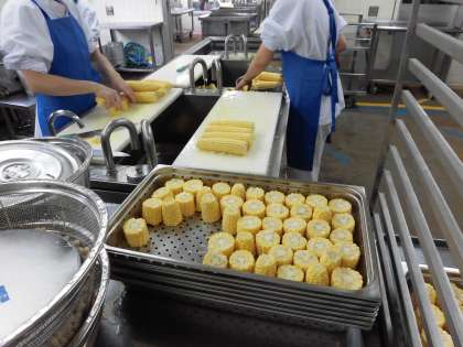感想には、皮をむくのが思ったより大変だった、皮はザラザラしていた、とうもろこしのひげとつぶの数が同じだとわかった、給食の時間になって早く食べたいなどとうもろこしの皮むきからいろいろなことを学ぶことができました。むいたとうもろこしは蒸しとうもろこしになりました。