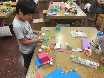 「タイヤをつけて出発進行」です。タイヤをつけて走るおもちゃを作っています。一人ひとりこだわりがあり、「ここがね、こうなって、そして・・・」とみんなうれしそうに説明してくれます。夢中になるって素晴らしい!