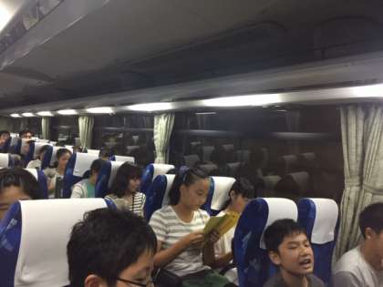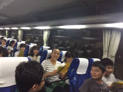 バスは高速に乗りました。バスレクが始まり、みんな大きな声で歌ってます。