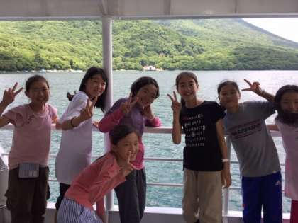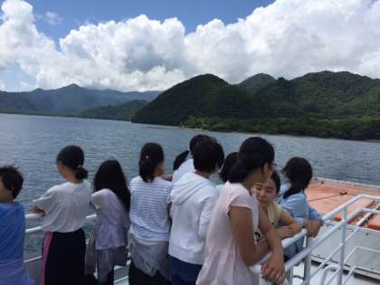 菖蒲が浜から遊覧船に乗っています。気持ち良い風、美しい山々、白い雲、青い空、最高です。