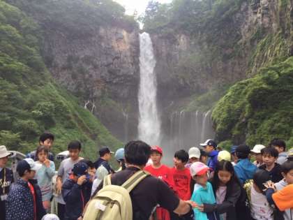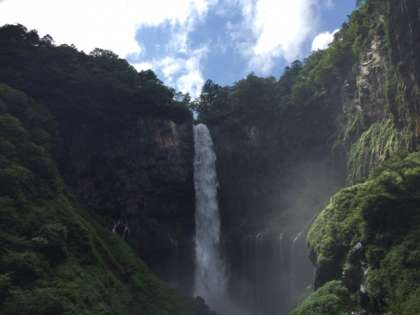 華厳の滝です。すごい水量です。記念写真を撮りました。