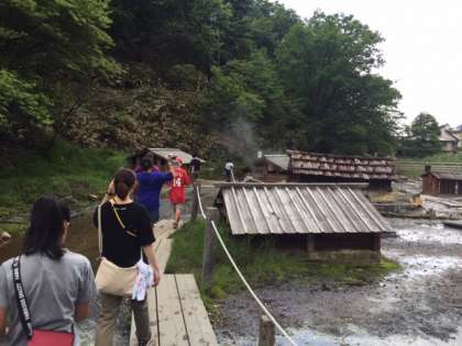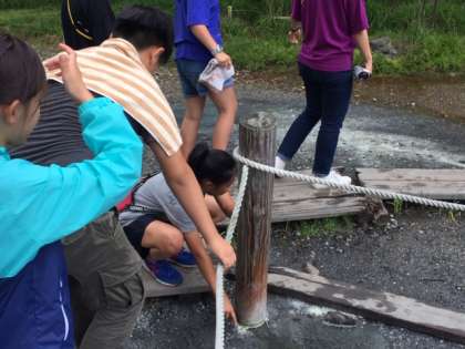 足湯のあと、源泉に行きました。硫黄の匂いが立ち込めています。みんな興味津々です。