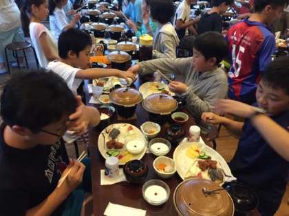 最後の夕食です。今日は一日歩いてお腹も減っています。この後は、話題の肝試しです。みんないっぱい食べましょう。