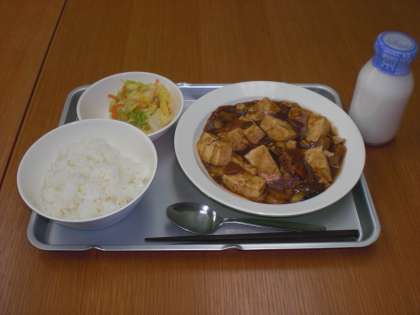 今日の給食は、ごはん・四川豆腐・牛乳・ラーパーツアィです。