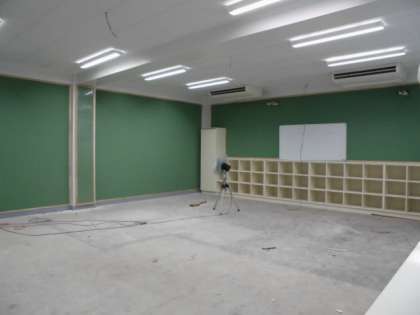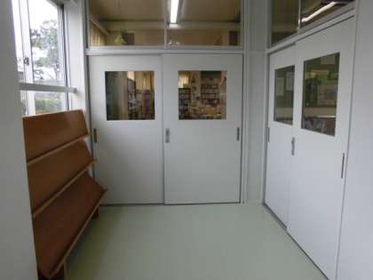 夏休みに入ってから世田谷小では、普通教室を増やす改修工事を行っています。新学期に向けて、新しい教室等ができあがってきました。写真は、新しくなった学校図書館の入口と、新しくできた教室の様子です。