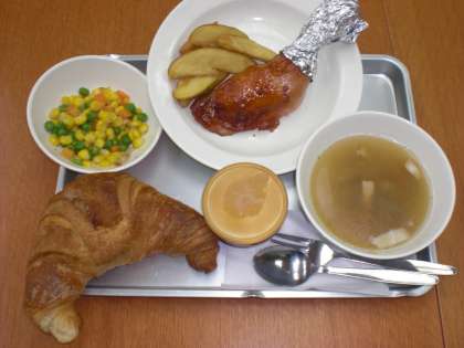 今日の給食は、クロワッサン・ローストチキン・フライドポテト・ミックスベジタブル・コンソメスープ・アイスクリームです。