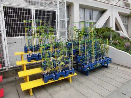 主事さんが、子どもたちの植木鉢を置くスタンドを作ってくれました。植木鉢を整頓して置けるし、風通しも良くなり、植物がよく育ちそうです。学校にいらした際はぜひご覧ください。