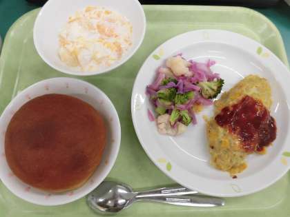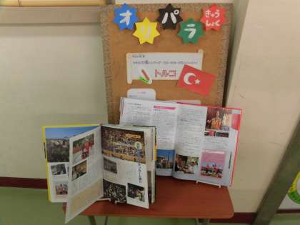 今月のオリパラ給食はトルコ料理です。トルコ料理の代表として「シシカバブ」が有名です。角切りの羊の肉を塩、こしょうで味付けして、金串にさした料理です。「シシ」は「串」、「カバブ」は焼いた肉料理という意味です。給食では、羊の肉の代わりに鶏肉を使ってハンバーグ風にアレンジしました。
