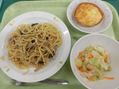今日はバースデー給食の日です。メニューは、きのこととり肉の和風スパゲッティ、キャベツサラダ、ようなしのコンポートケーキです。9月のお誕生日をむかえたみなさんおめでとうございます。