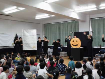 写真は、校長先生が特別ゲストで出演した「おとうさん」というお話と、今日にぴったりの「ハロウィンの歌」の場面です。紙芝居・ペープサート、歌、効果音・・・いろいろな工夫が盛りだくさんで、お話の世界に引き込まれました。