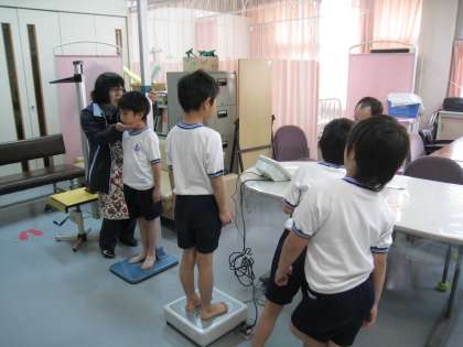 4月22日(金)に全学年の身体計測がありました。初めに体重、そして身長・坐高と測りました。どの子も進級して自分の体がどのくらい大きくなったか興味津津でした。
