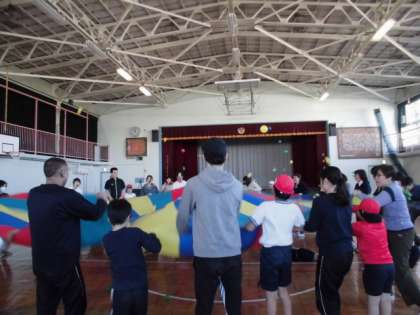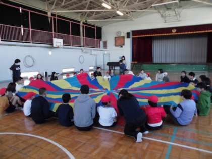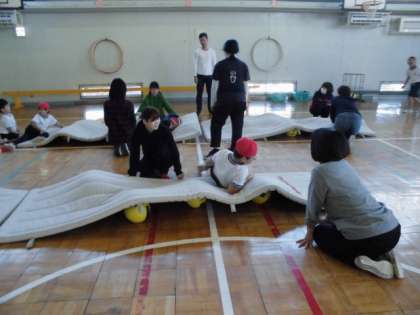 仲よし学級で体操教室を行いました。マットの下にボールを入れて、その上を歩いたり、転がったりしました。また、みんなでバルーンを持って膨らませたり、ミニボールをポップコーンのようにはじいたりしました。親子で楽しみました。