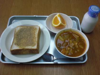 今日の給食は、セサミトースト・牛乳・ボルシチ・清見オレンジです。