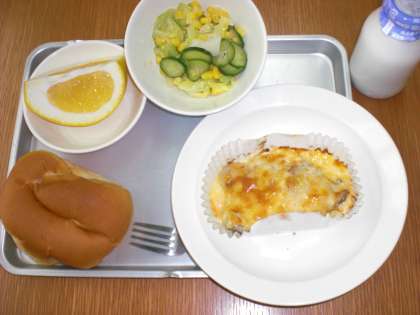 今日の給食は、ミルクパン・牛乳・魚のマヨネーズ焼き・コーン入りフレンチサラダ・美生柑です。